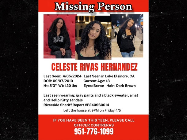 Celeste Rivas Hernandez, born on September 7, 2010 (aged 15), was reported missing in May 2024. She was last seen in Lake Elsinore, CA, wearing gray pants, a black sweater, a hat, and Hello Kitty sandals.